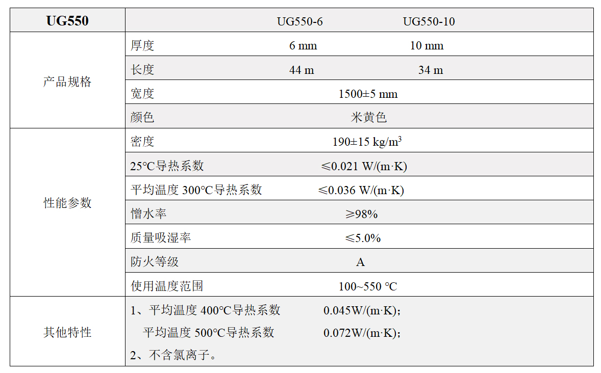 UG550系列為高溫型產品,推薦使用溫度為250℃~550℃。高溫保溫性能優異,主要應用于煉油、化工、電力、核能、冶金、太陽能光熱等領域的高溫管道及設備保溫。