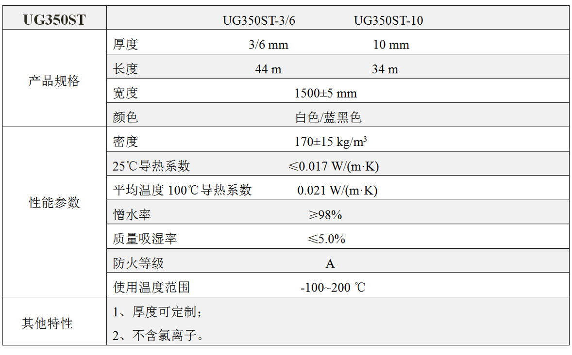 UG350ST系列為超低導熱系數產品,最佳使用溫度為-100℃~200℃。主要應用于對導熱系數要求較高的客戶,推薦應用領域為高鐵、動車、地鐵、新能源汽車等領域的隔熱保溫。